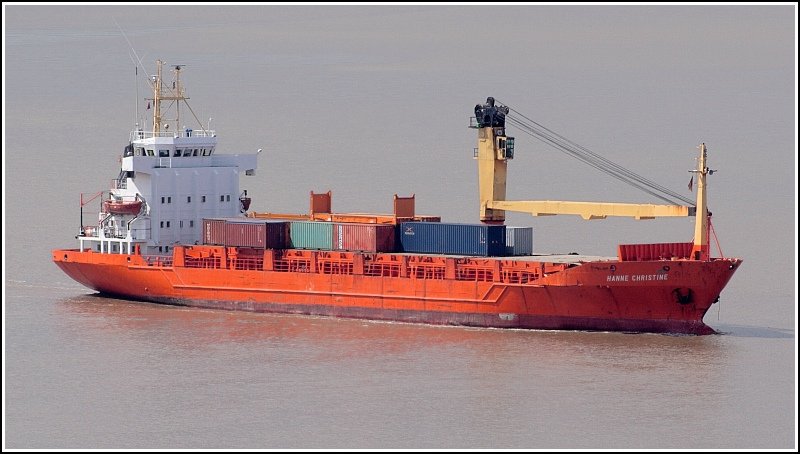 Die 1984 von der Krögerwerft in Rendsburg abgelieferte HANNE CHRISTINE (IMO 8318075) fuhr auch schon unter den Namen GRIMSNIS, VILLE DU MISTRAL, CARIBE CARRIER und CARIBBEAN BREEZE. Dieser Feeder ist 89,8 m lang, 16 m breit und hat eine GT/BRZ von 2970. Auf dem Foto war sie am 19.06.2007 unter der Flagge Norwegens mit Heimathafen Oslo auf der Weser Richtung Nordsee unterwegs. Helmut Seger