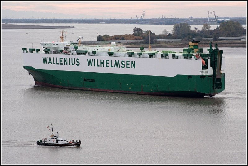 Die 1999 gebaute ELEKTRA (IMO 9176577) fährt am 20.10.2007 Weser aufwärts Richtung Bremen. Sie ist 227,9 m lang, 32,3 m breit, hat eine GT/BRZ von 67264 und kann 7.200 PKW oder 3.700 PKW und 600 LKW laden. Heimathafen ist Stockholm in Schweden. Im Vordergrund fährt das ehemalige Lotsenboot BREMERLOTSE in entgegengesetzte Richtung. Helmut Seger