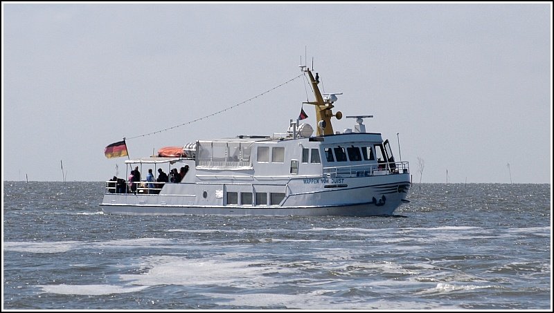 Mit der kleinen Fähre WITTE KLIFF werden Besucher von Helgoland zur Düne und zurück gebracht. Hier läuft sie gerade in den Schutzhafen der Düne ein. Aus dem Seenebel um Helgoland ragen Antennenmasten heraus. Scan eines Dias vom 05.09.2004. Helmut Seger