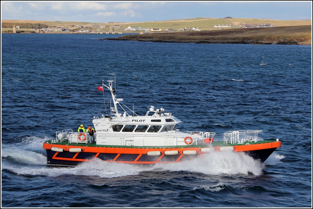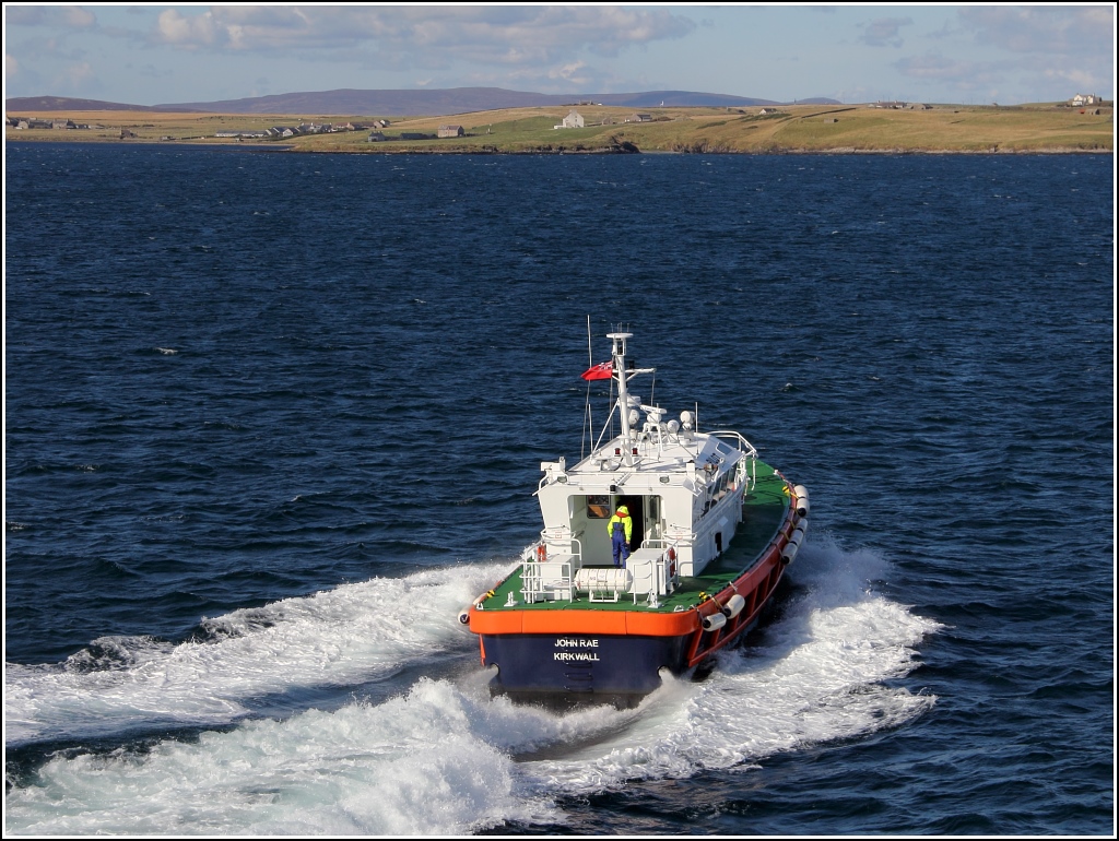 Das Lotsenboot JOHN RAE wurde 2010 bei Uudenkaupungin Työvene Oy in Uusikaupunki (Finnland) gebaut. Die JOHN RAE ist 21,8 m lang, 5,75 m breit und hat eine Maschinenleistung von 2 x 647 kw, die eine Geschwindigkeit von 21,6 kn ermöglicht. Heimathafen ist Kirkwall auf den Orkney Inseln (Großbritannien). Im Hintergrund ist die Insel Shapinsey zu sehen. 23.09.2012
