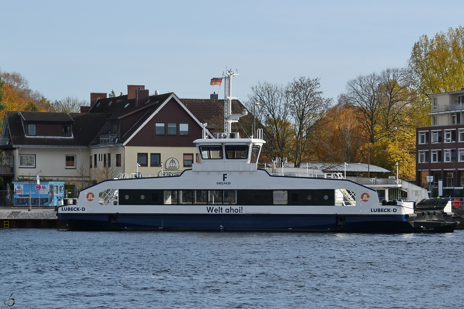 Die Fähre Pötenitz (ENI: 05116870) ist hier Anfang November 2025 bei der Fahrt von Priwall nach Travemünde zu sehen.