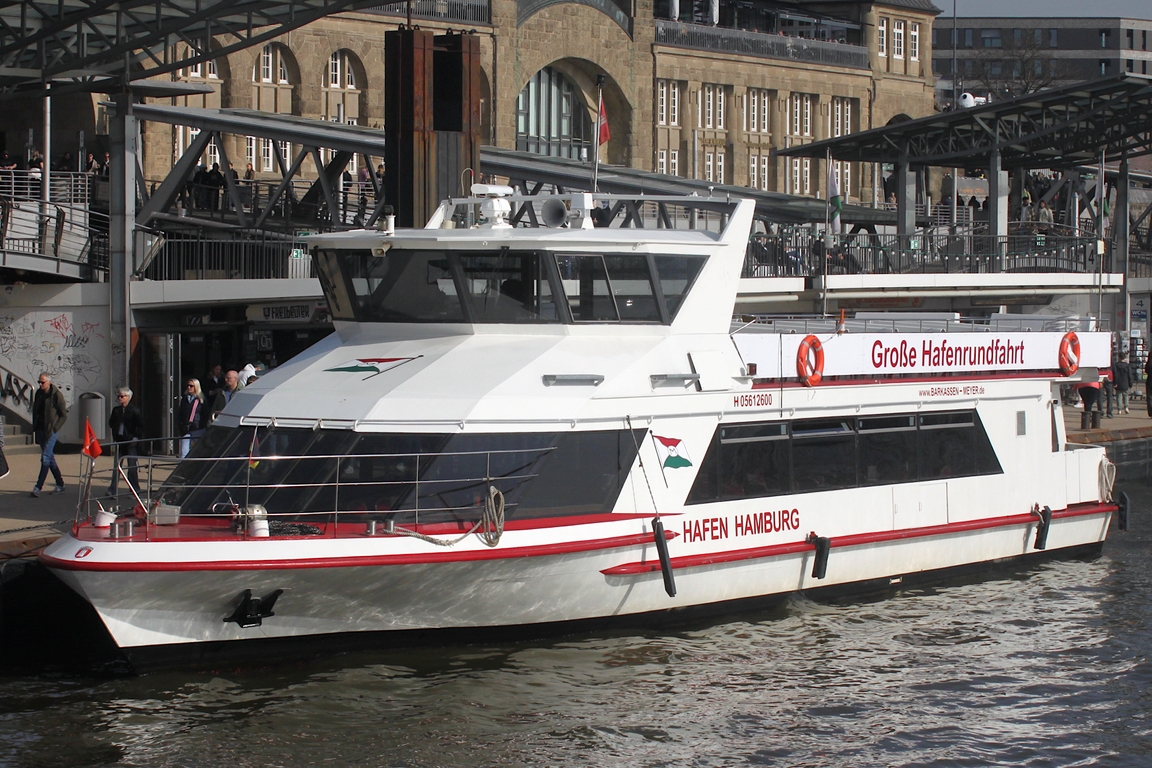 MS HERTHA QUANDT , MMSI: 211548850,Rufnummer: DG4782, läuft von der Trave in den Klughafen. Der Skipper hat gerade die Personen am Heck gebeten, eventuell den Kopf eizuziehen und auf keinen Fall aufzustehen... Aufgenommen: 27.4.2012