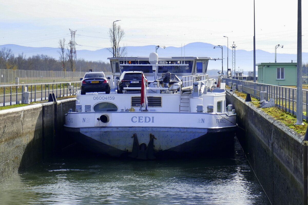 GMS Cedi, ENI 06004159, wird in der Schleuse Vogelgrün/Elsaß rheinaufwärts geschleust, Nov.2025