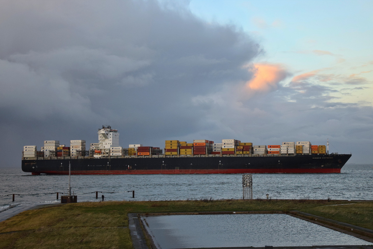 ,,CMA CGM Tosca`` Containerschiff. Heimathafen Marseille. Baujahr: 2005, IMO: 9299783, Container: 8488 TEU, Länge: 334.07 m, Breite: 42.80 m, Tiefgang: 14.52 m, Geschw: 23.00 kn, Maschinenleistung: 69551 KW. In Wedel einlaufend nach Hamburg am 07.10.15.