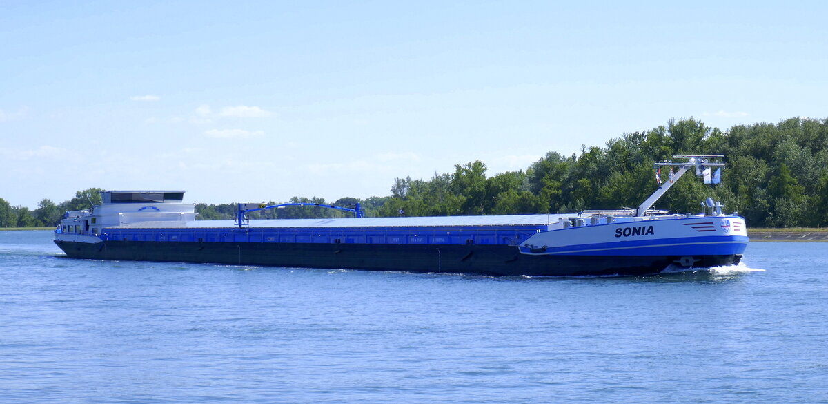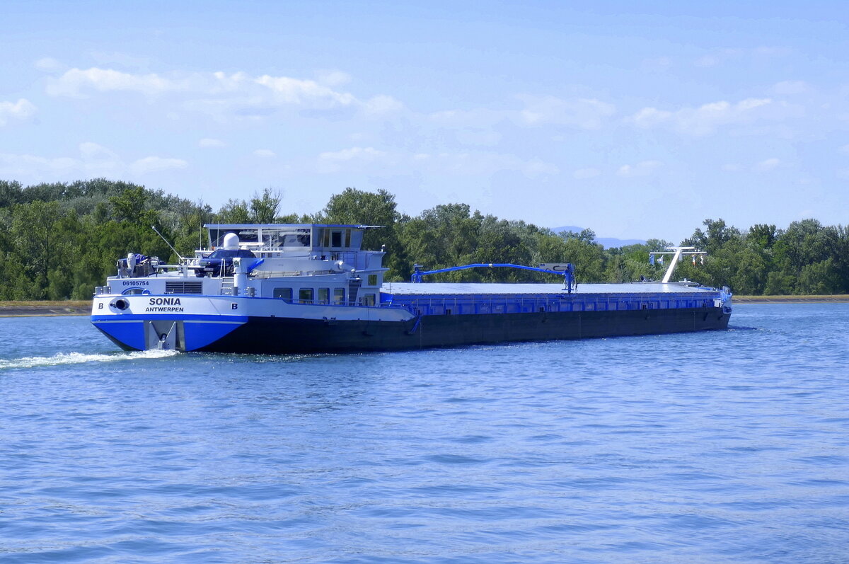 GMS Sonia, ENI 06105754, rheinabwärts vor der Staustufe Rhinau/Elsaß, Juli 2025
