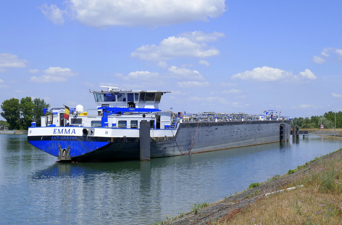 TMS Emma, ENI 06004166, rheinabwärts in Wartestellung vor der Staustufe Marckolsheim/Elsaß, Juli 2025