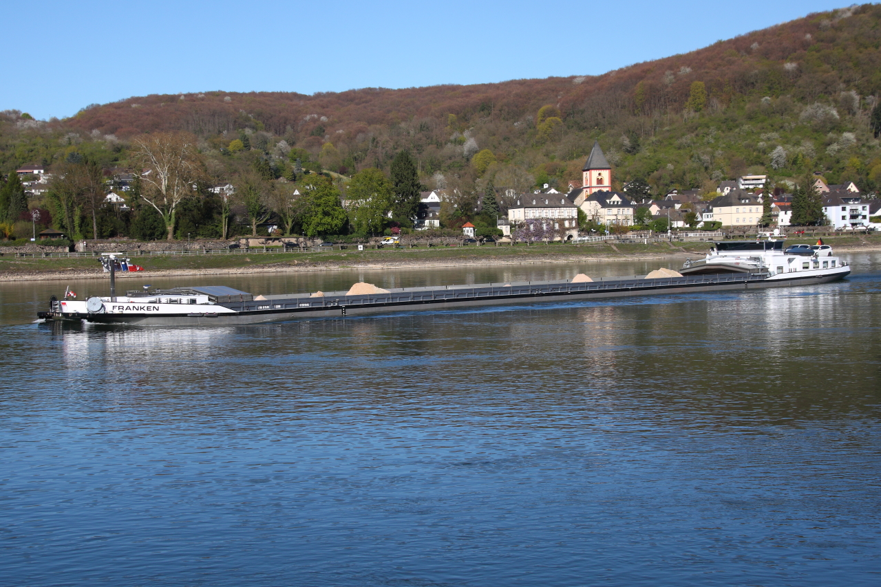 GMS FRANKEN, ENI 02331045, Flagge DEU. Rheinabwärts bei Remagen am 07.04.2026.