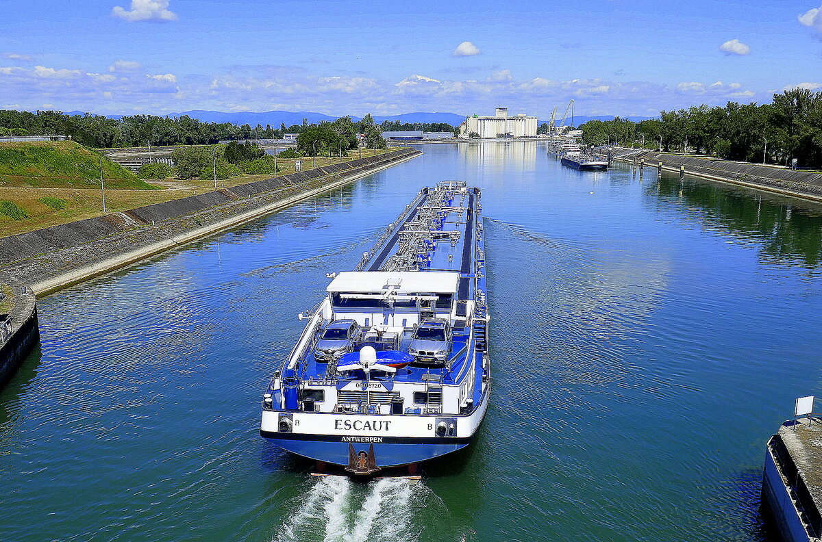 KFGS Amaviola, ENI 07002043, ankert vor der Staustufe Vogelgrün/Elsaß, Juni 2025