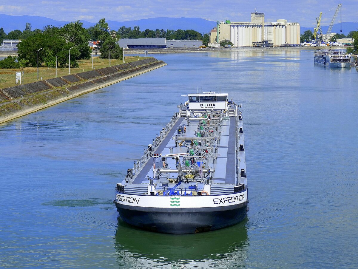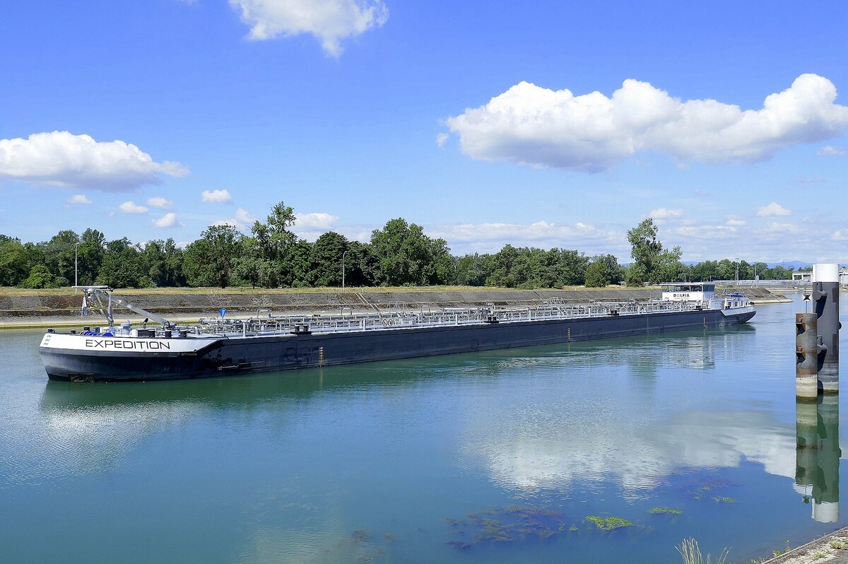 TMS Expedition, ENI 02338210, in Wartestellung vor der Staustufe Vogelgrün/Elsaß, Juni 2025
