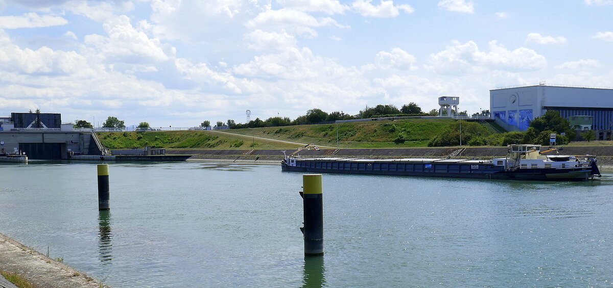 TMS Nicole II, ENI 02321119, wird in der Schleuse Vogelgrün/Elsaß rheinabwärts geschleust, Juli 2025