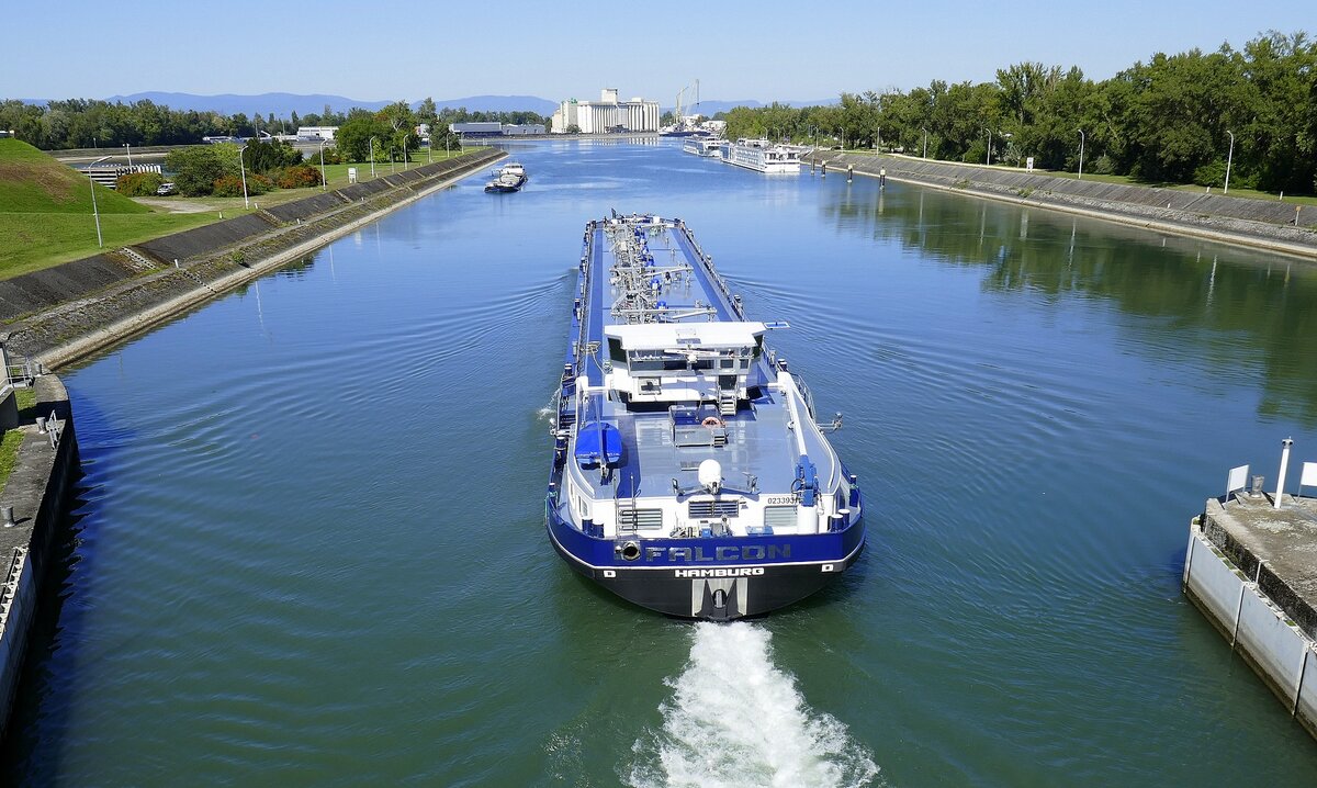 TMS Falcon, ENI 02339315, verläßt die Schleuse Vogelgrün/Elsaß rheinabwärts, Sept.2025