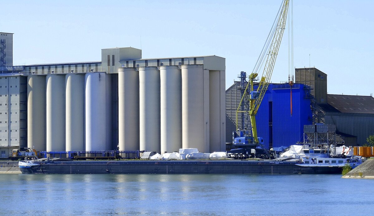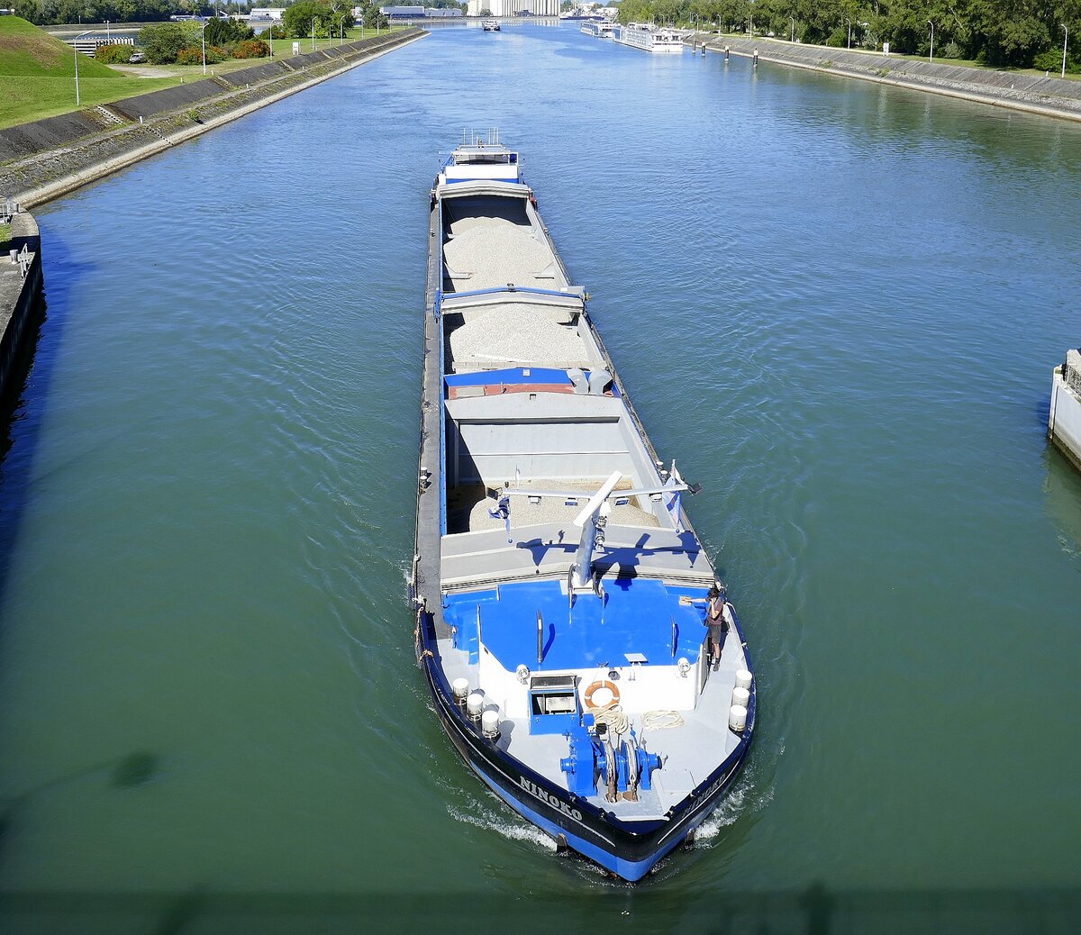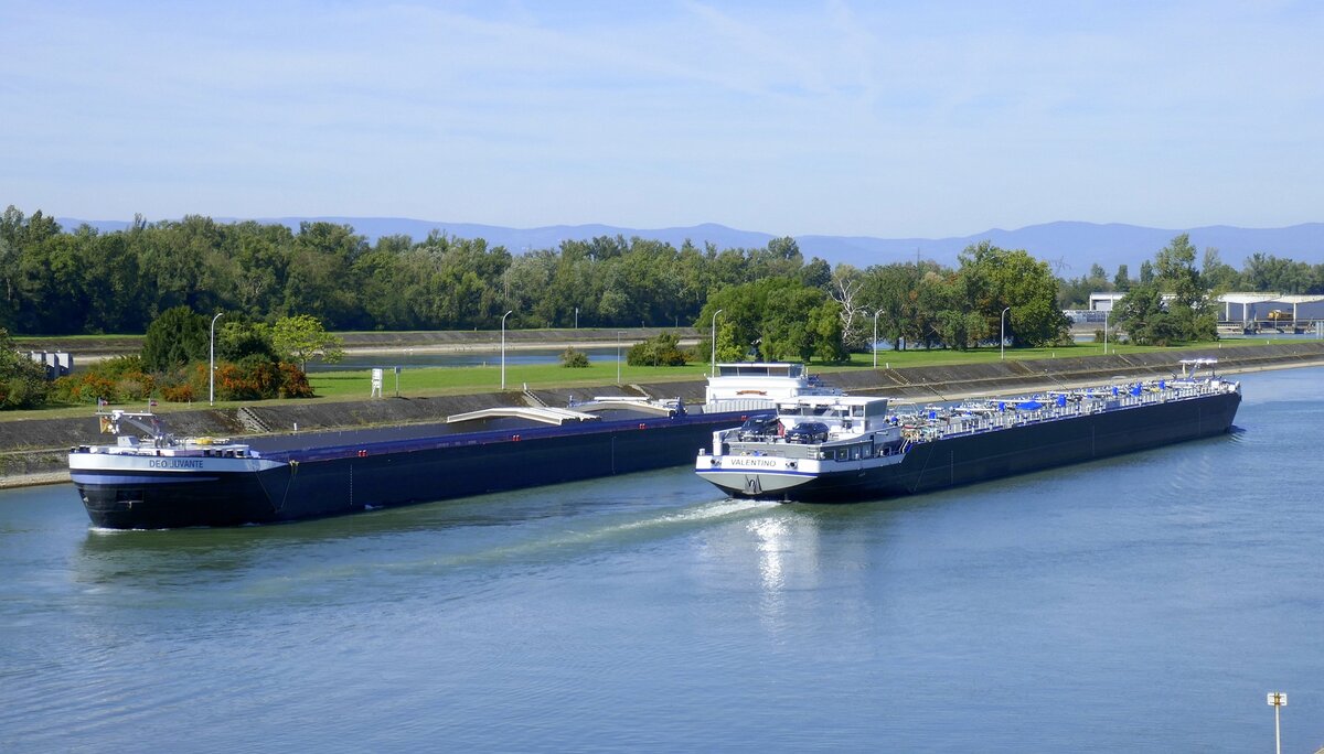 Die Gütermotorschiffe "Splendor" (02328238) und "Mondeo" (02328092), weiter hinten das Tankmotorschiffe "Antigua" (02336832) auf dem Rhein. (Düsseldorf, Juni 2018)