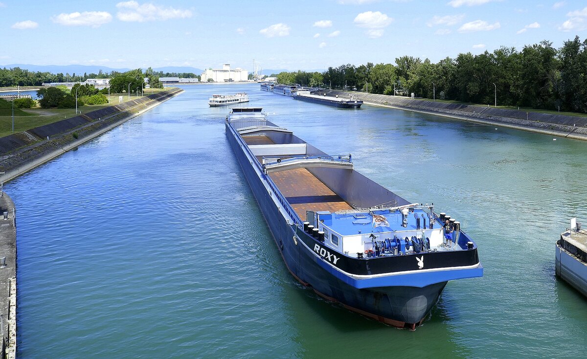 Im Bild das Gütermotorschiff ROSA-RENATE (ENI: 04606620), welches Mitte April 2021 auf dem Rhein unterwegs war.