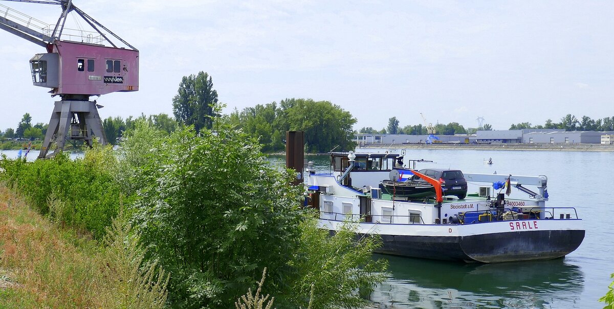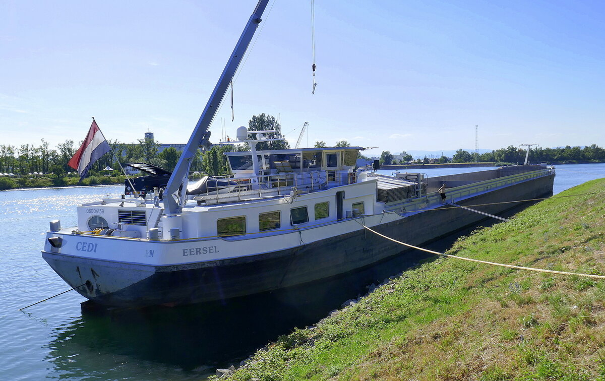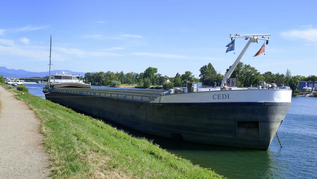 Das mit Kohle beladene Gütermotorschiff ALLIANCE (ENI: 02329651) ist hier Anfang Mai 2021 unter der Brücke der Solidarität in Duisburg.