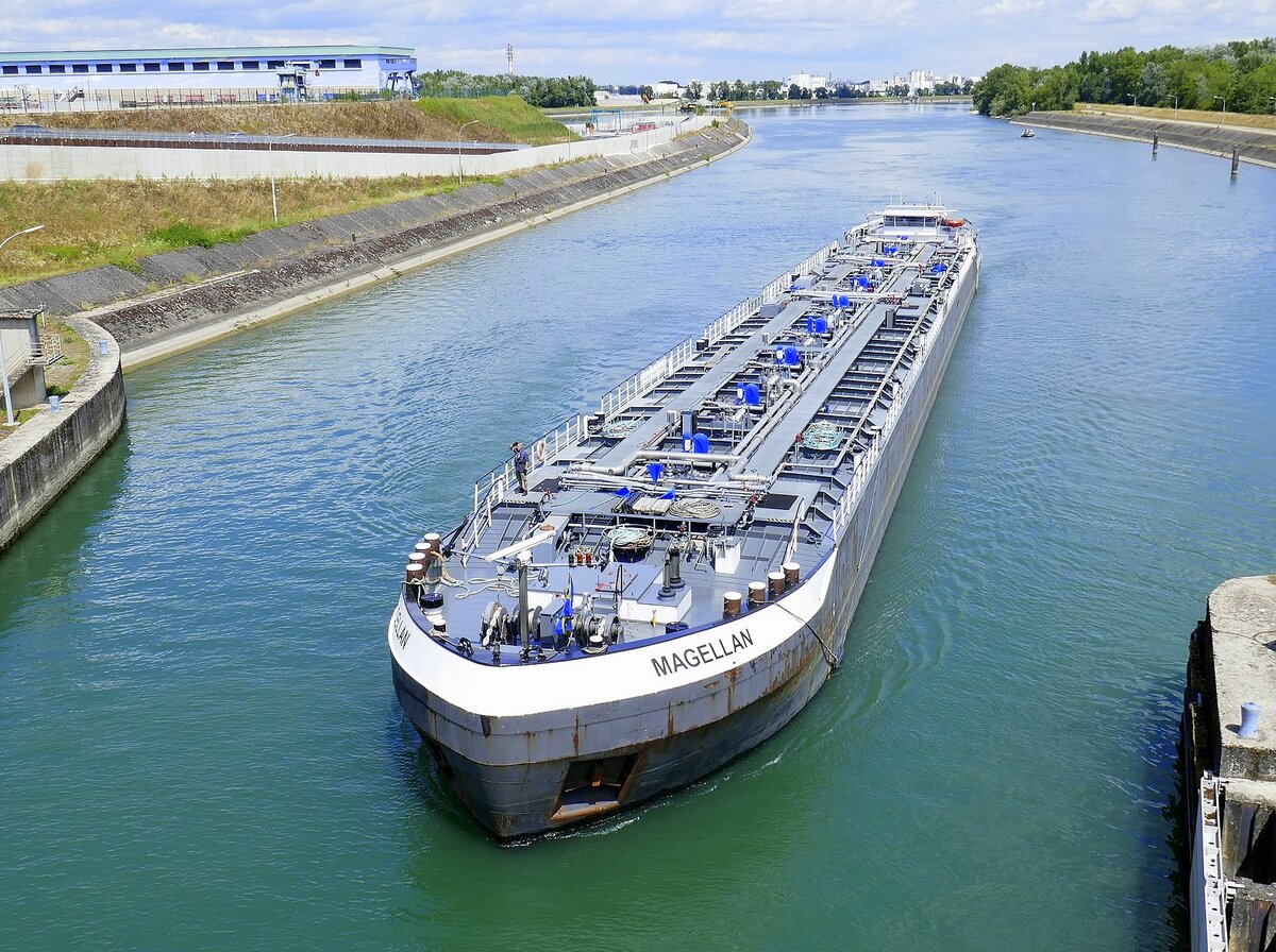 TMS Magellan, ENI 02324738, rheinaufwärts bei der Einfahrt in die Schleuse Vogelgrün/Elsaß, Juli 2025