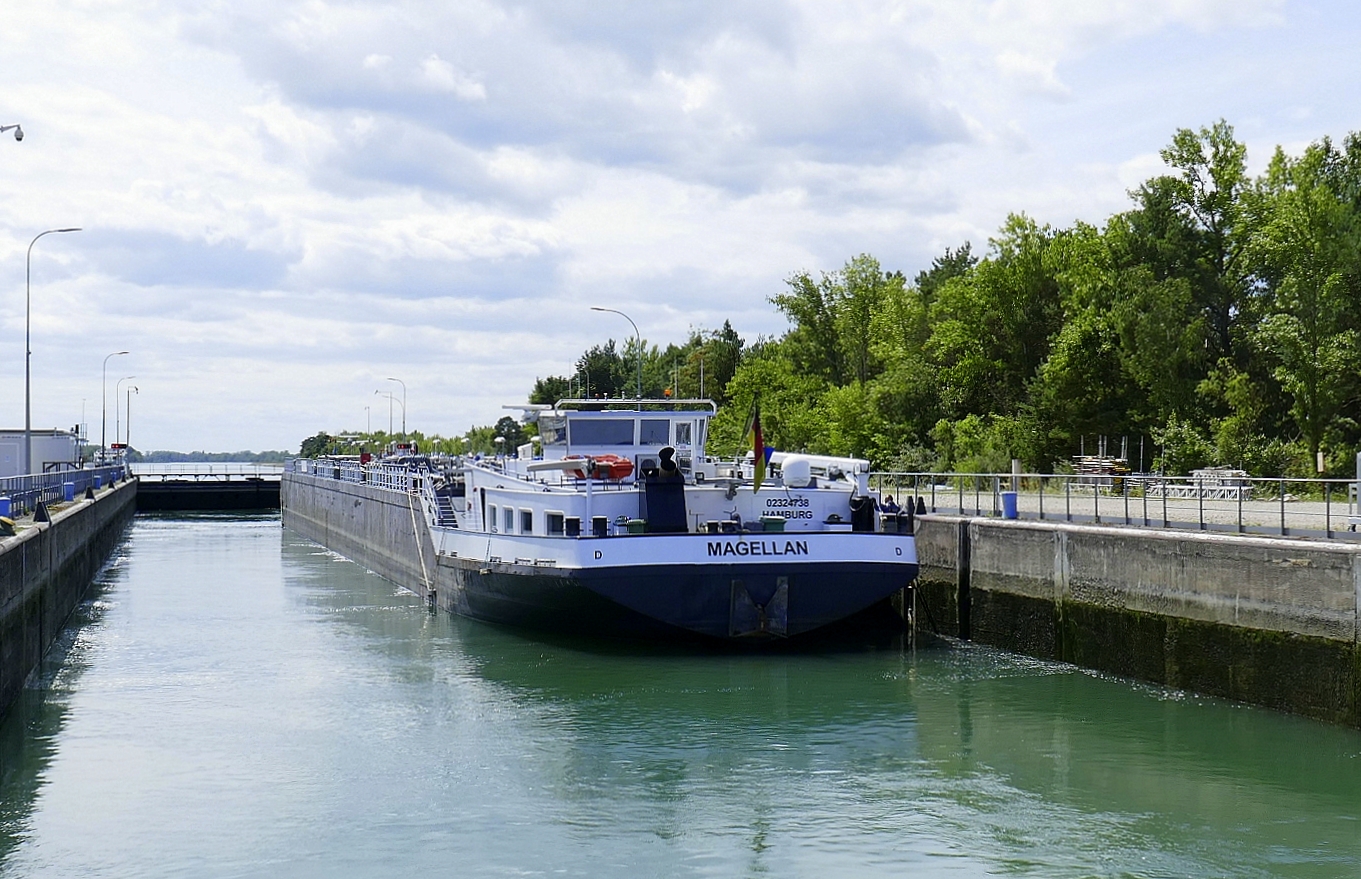 TMS Magellan, ENI 02324738, wird in der Schleuse Vogelgrün/Elsaß rheinaufwärts geschleust, Juli 2025
