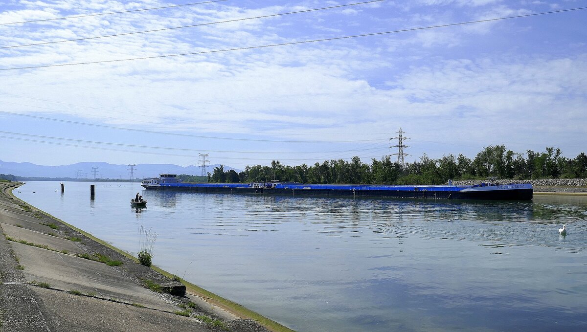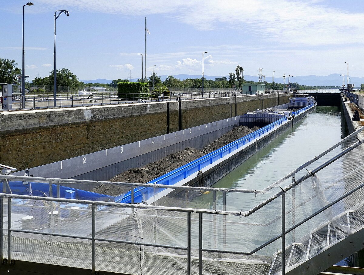 SGMS und GSL W De Beijer, rheinabwärts in Warteposition vor der Schleuse Vogelgrün/Elsaß, Heckansicht, Mai 2025