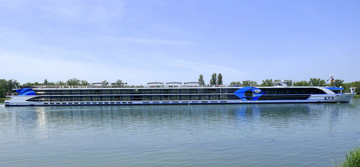 KFGS Viva One, ENI 07002160, ankert an der Staustufe Vogelgrün/Elsaß am Rhein, Juni 2025