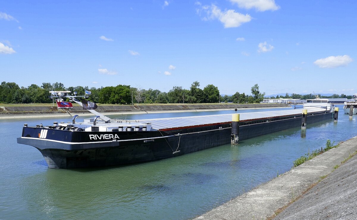 GMS Riviera, ENI 02333392 rheinaufwärts, in Wartestellung vor der Staustufe Vogelgrün/Elsaß, Heckansicht, Juni 2025