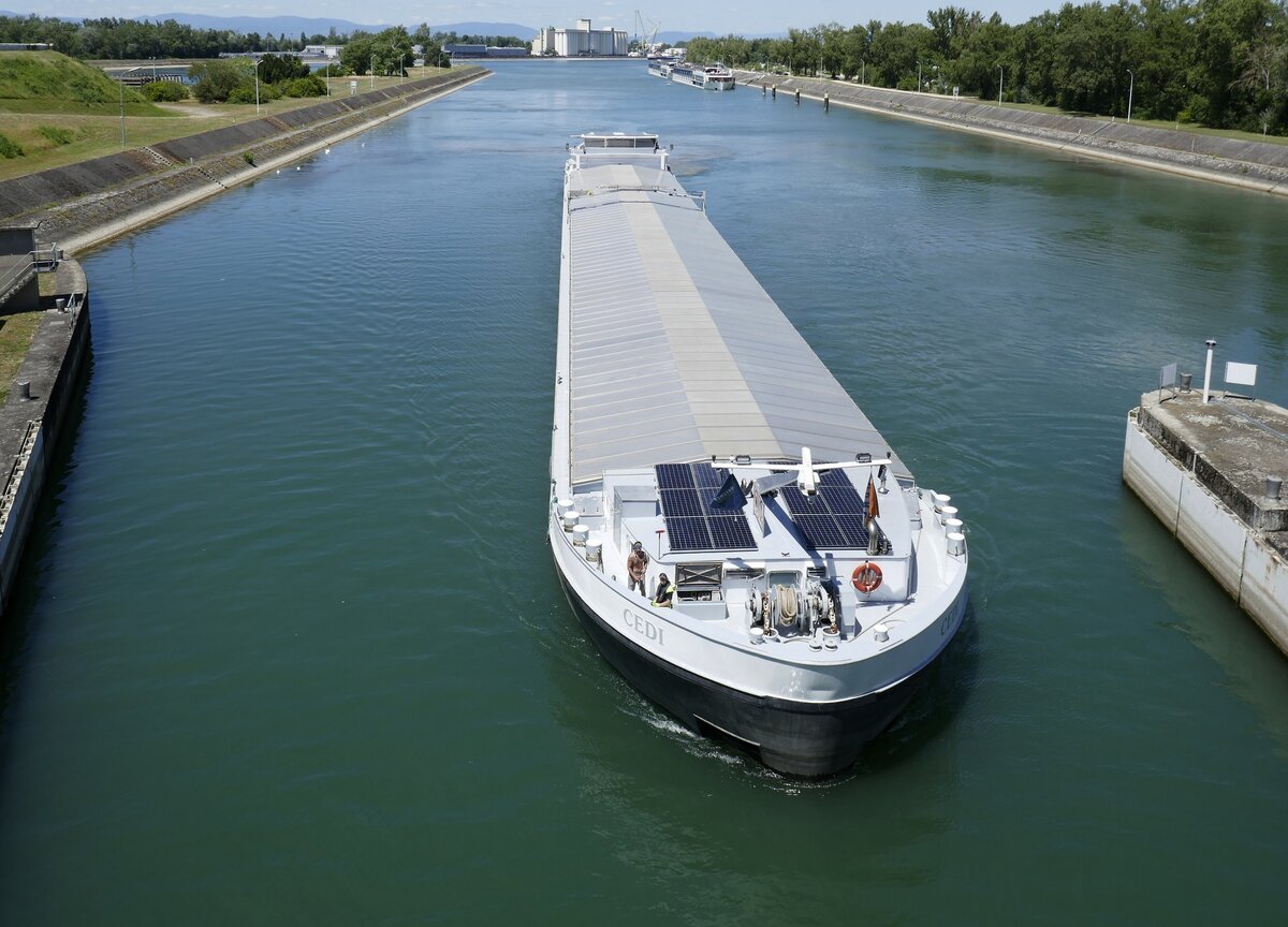 GMS Cedi, ENI 06004159, verläßt die Schleuse Vogelgrün/Elsaß und fährt rheinaufwärts, Juni 2025