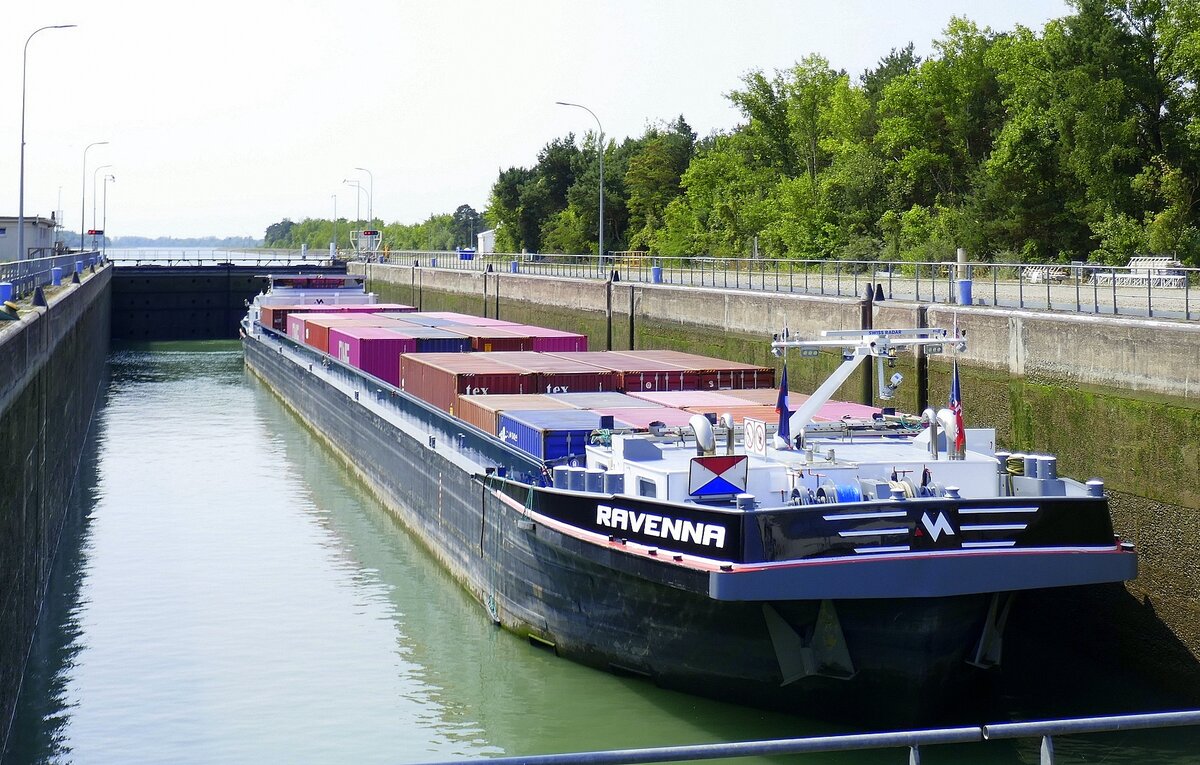 TMS Stolt Main, ENI 02320282, wird in der Schleuse Vogelgrün/Elsaß rheinabwärts geschleust, Aug.2025