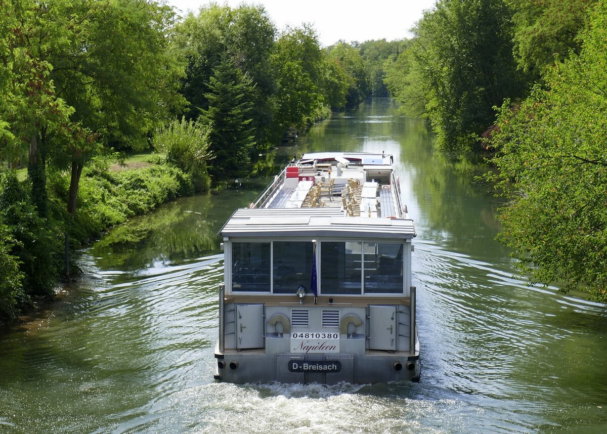 FGS Napoleon, ENI 04810380, hat den Anleger Kunheim/Elsaß verlassen und fährt auf dem Neubreisachkanal zurück in den Heimathafen Breisach am Rhein, Aug.2025