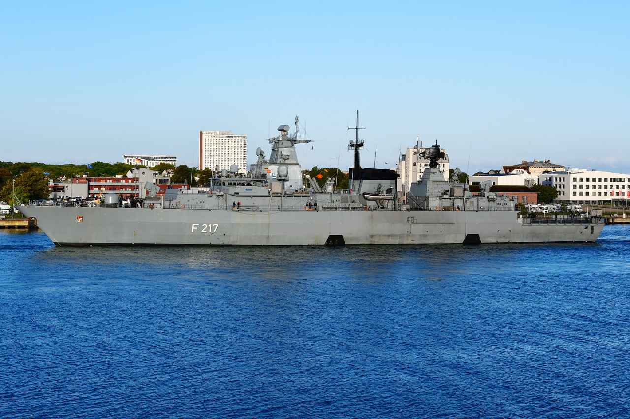 Fregatte F 213 AUGSBURG; Aufnahmeort: Elbe/Hafen Hamburg, Deutschland; Datum: 10.05.2015; Info: Das Bild entstand anlässlich der Auslaufparade des 826. Hamburger Hafengeburtstages. Sven Grimpe