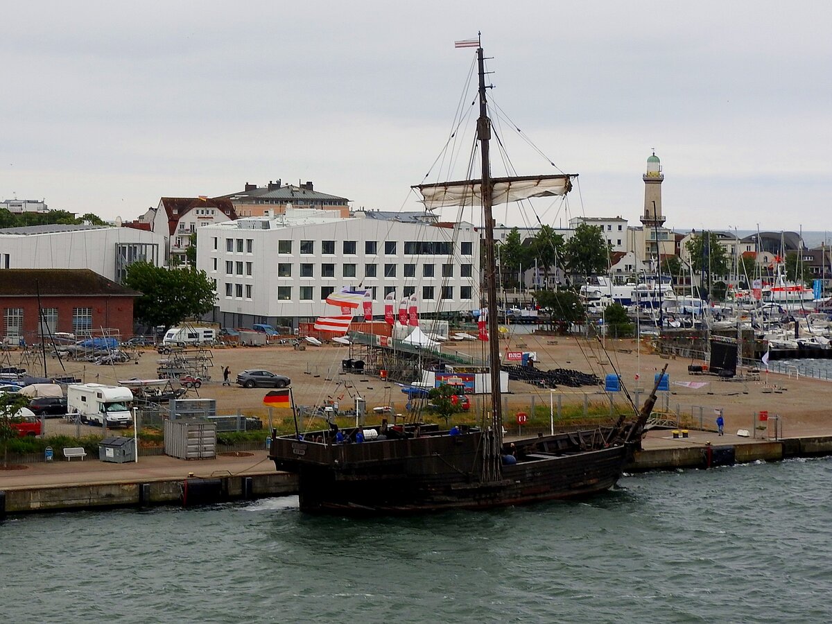 WISSEMARA-Wismar, ein Nachbau der Poeler-Kogge; L=31,5m; B=8,5m; Segelfläche:240m²; Hilfsantrieb:255kW) hat in Warnemünde festgemacht; 250712