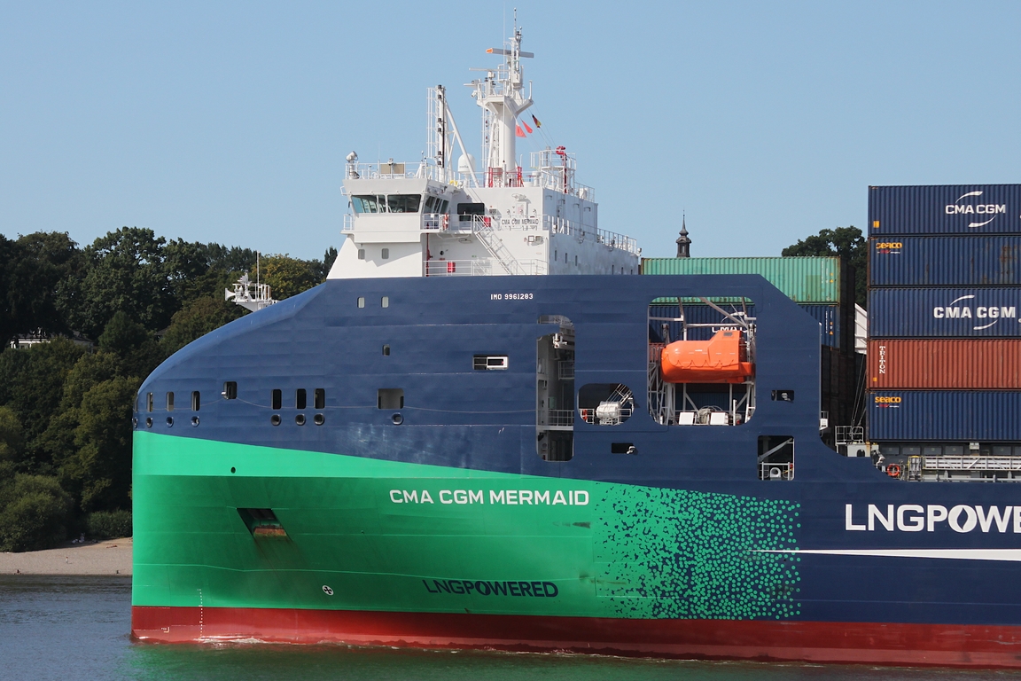 Das 300m lange Containerschiff CMA CGM Rabelais am 28.05.17 auf der Weser mit Anfahrt Bremerhaven