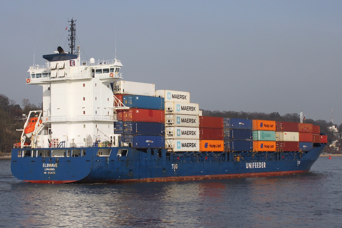 Schiffsbegegnung auf der Elbe bei Twielenfleth zwischen den nach Hamburg einlaufenden Kühlfrachter Spring Deli und dem Containerriesen Ever Steady aufgenommen am 01.10.11