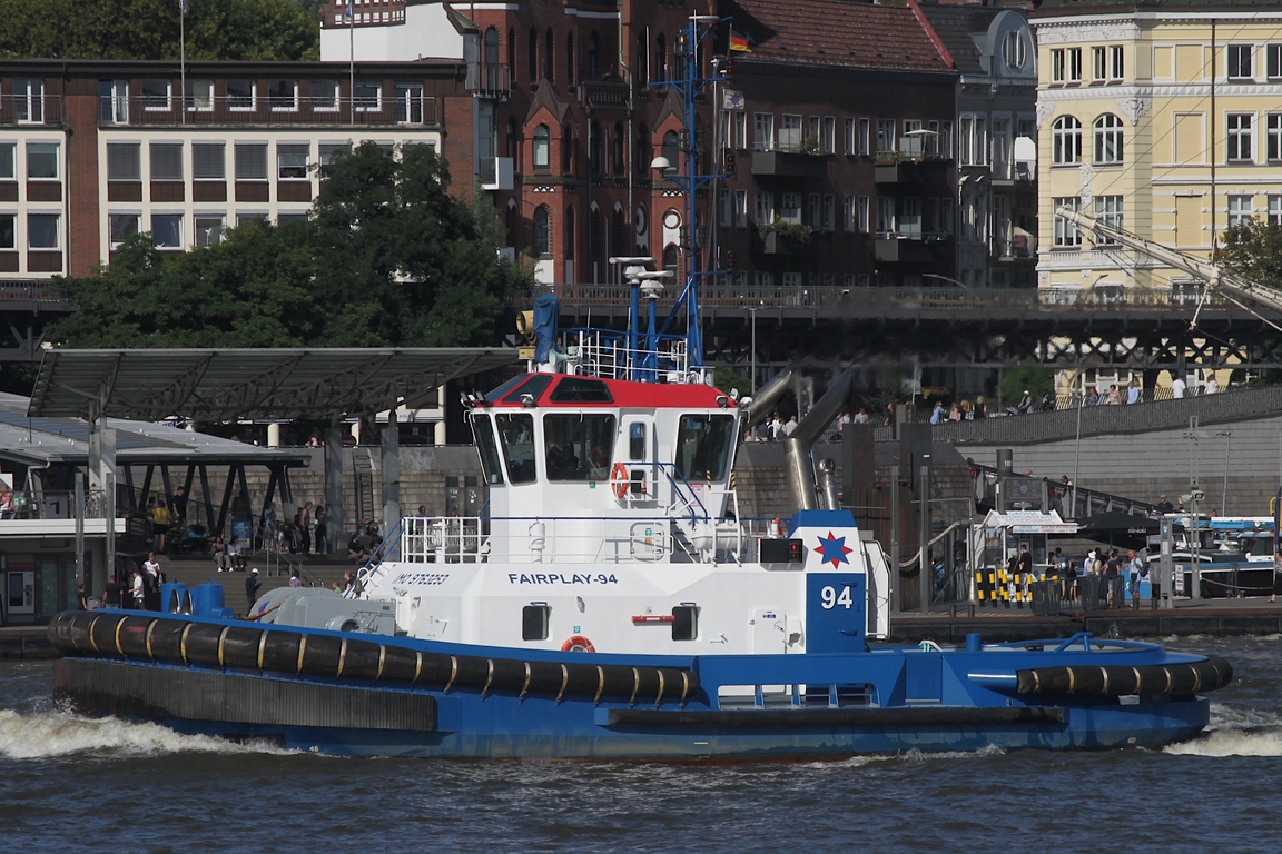 Schlepper FAIRPLAY-94 (IMO 9763253); Eigner/Betreiber: Fairplay; Datum: 11.08.2025; Aufnahmeort: Elbe/Hafen Hamburg, Deutschland.