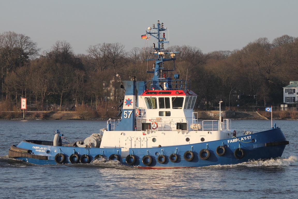 Schlepper FAIRPLAY-95; Eigner/Betreiber: Fairplay; Aufnahmeort: Elbe/Hafen Hamburg, Deutschland; Datum: 03.06.2025; Info: IMO 9964041. Das Bild zeigt FAIRPLAY-95 am Schlepperponton in Neumühlen.