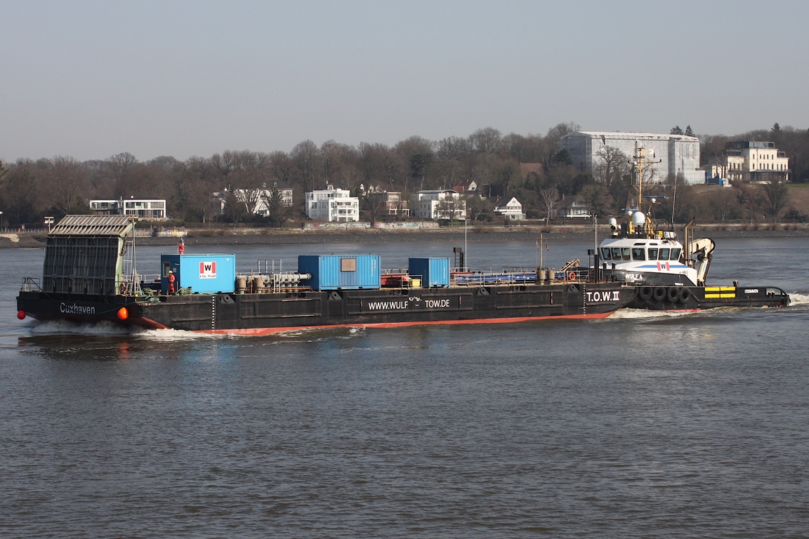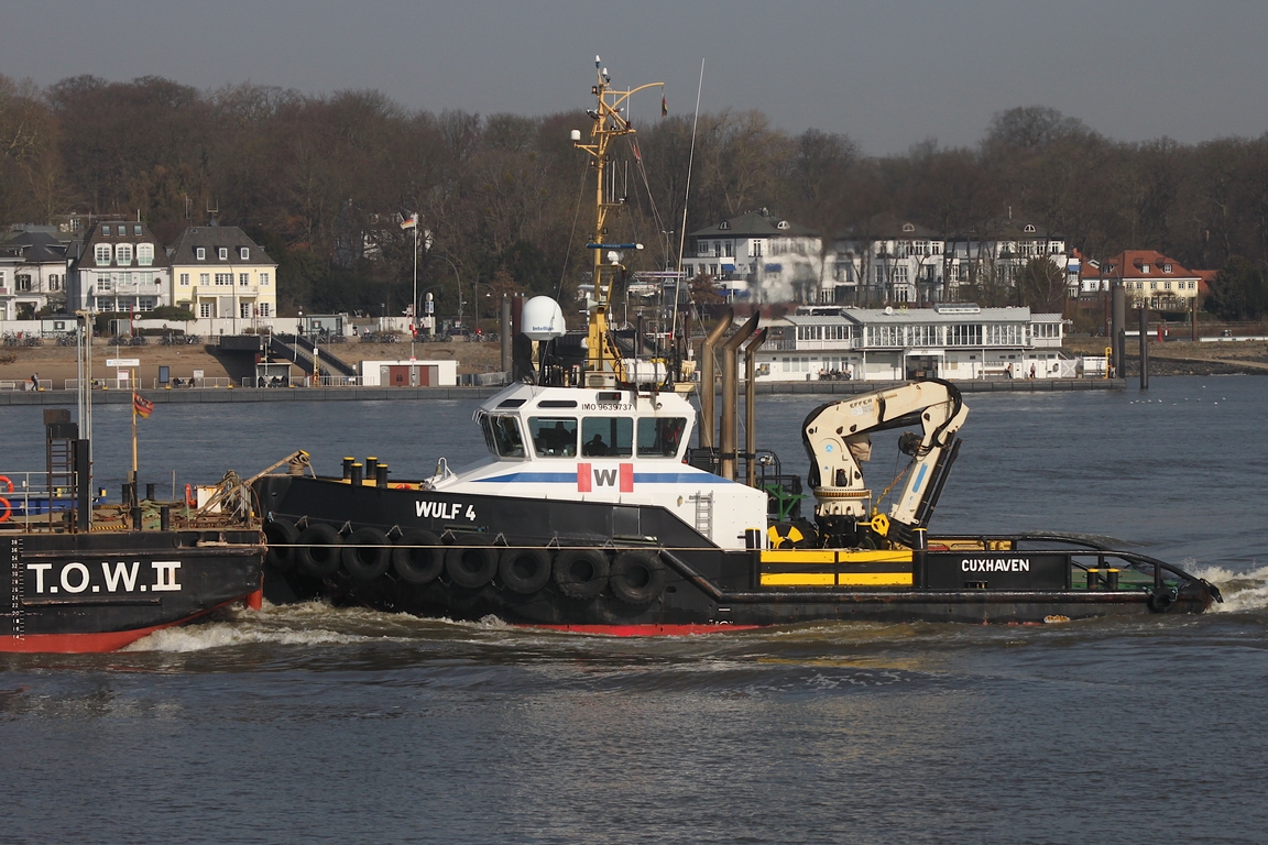 Schlepper WILHELMINE; Aufnahmeort: Elbe/Hafen Hamburg, Deutschland; Datum: 05.05.2011; Info: (IMO 8007133) Lüa 26,19 m, B 8,84 m, TG 4,4 m / 2 Schottel, 2 Diesel, 4-Takt, 6-Zyl., Deutz SBA6M528, ges. 1280 kW (1740 PS), 11kn, Pfahlzug 27 t / 1980 bei Mützelfeldtwerft, Cuxhaven. Das Bild zeigt die WILHELMINE vor den St.Pauli Landungsbrücken.