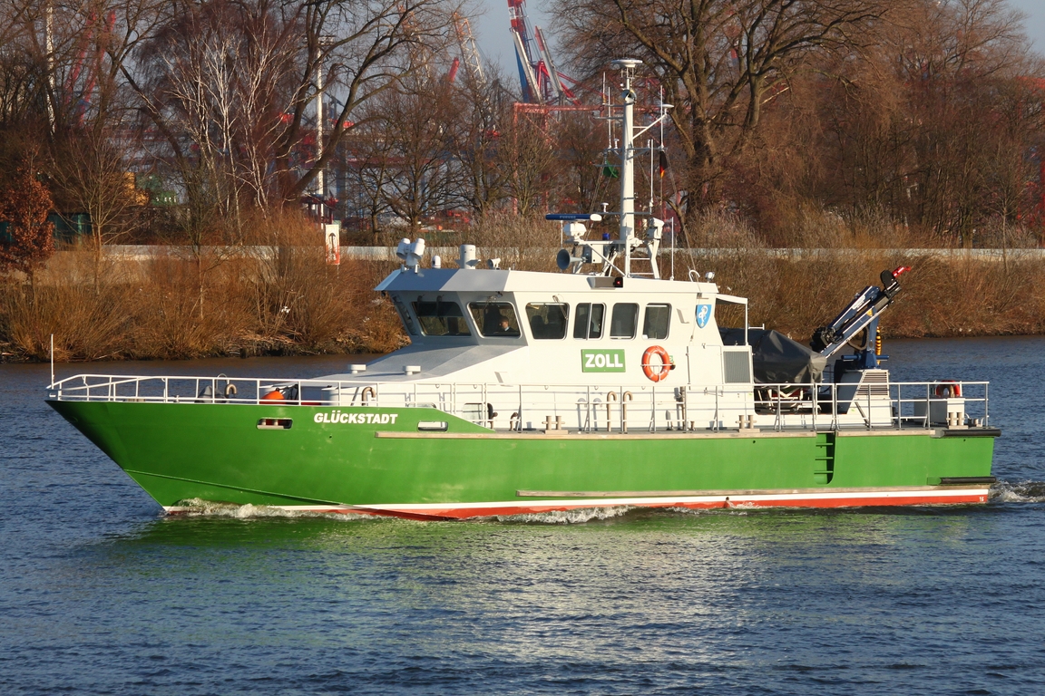 Zollboot AMRUM am 22.04.2022 auf der Trave bei Lübeck Höhe Dummersdorfer Ufer