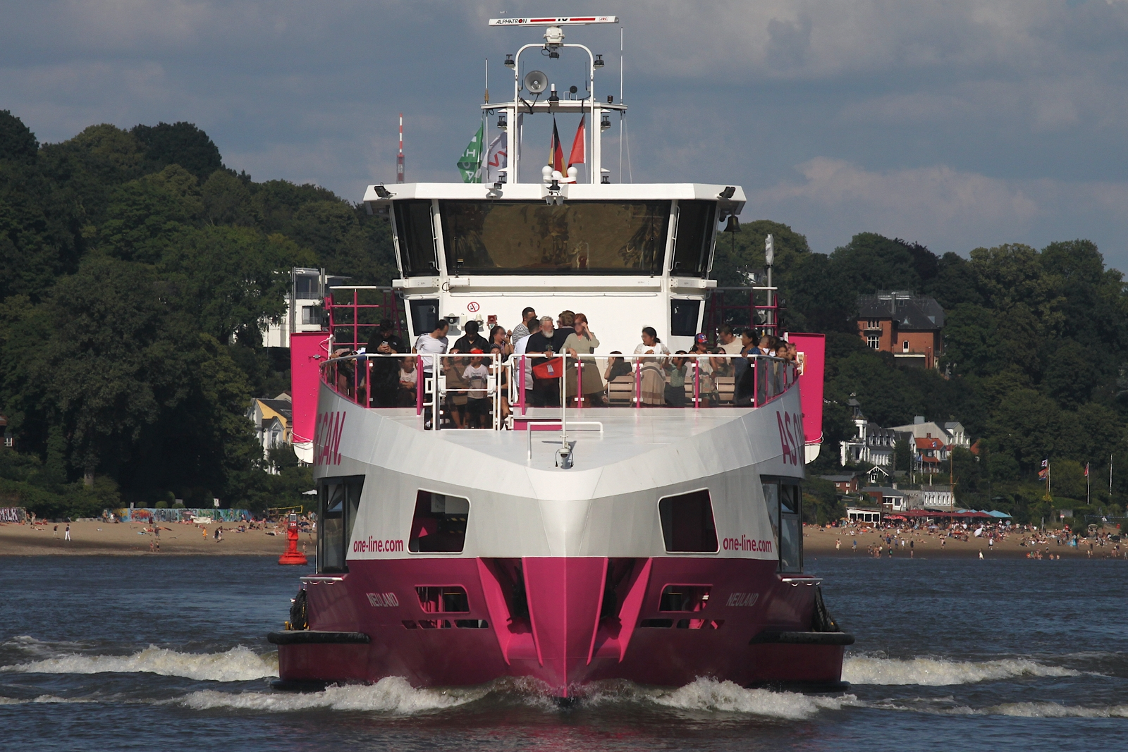 Hadag Hafenfähre REIHERSTIEG (ENI 04811570); Eigner/Betreiber: Hadag; Datum: 28.09.2025; Aufnahmeort: Elbe/Hafen Hamburg, Deutschland. Das Bild zeigt die REIHERSTIEG oberhalb Teufelsbrück.