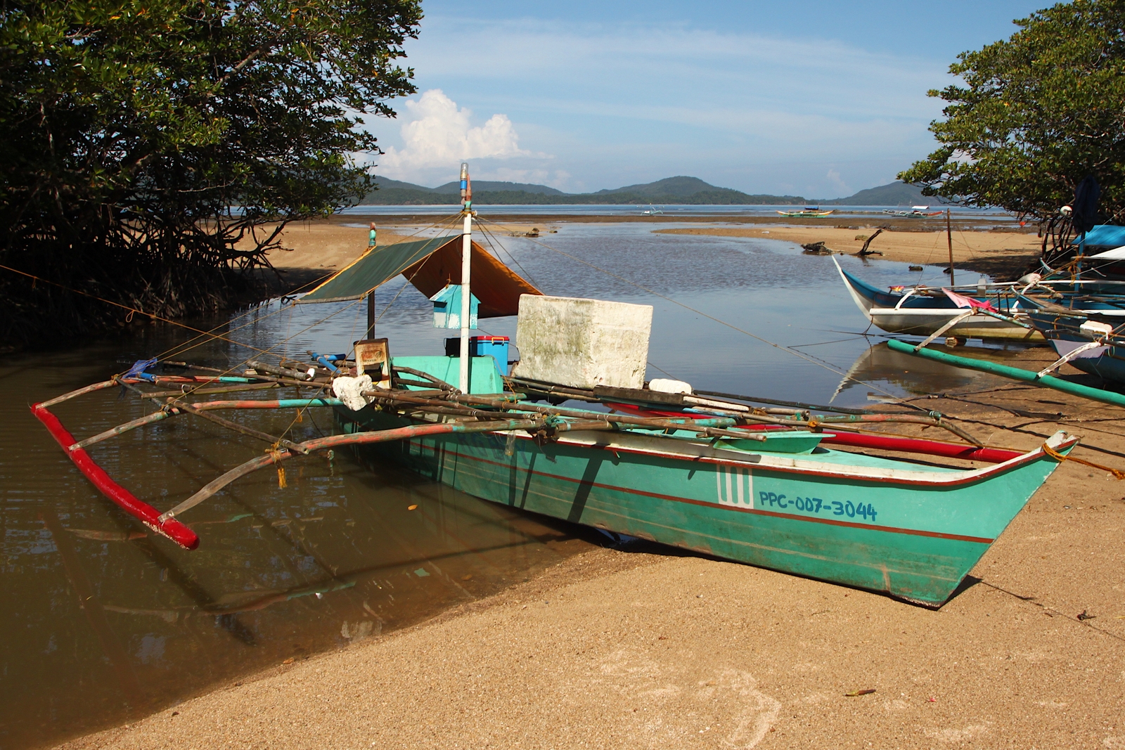 Traditionelles Fischerboot ANGELO ZANDER (PPC-005-1893); Eigner/Betreiber: unbekannt/privat; Aufnahmeort: Sulusea (Pacific Ocean), Puerto Princesa, Insel Palawan, Philippinen; Datum: 05.11.2012; Info: Fast alle kleinen (Fischer)boote auf den Philippinen sind beidseitig mit Auslegern versehen, die den schmalen und schnittigen Bootsrümpfen eine erstaunliche Seetüchtigkeit verleihen.