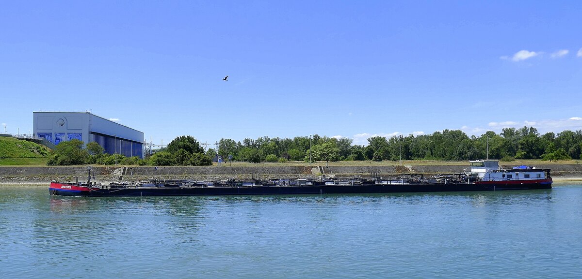 TMS Piz Dolf, ENI 02338481, rheinabwärts vor der Staustufe Rhinau/Elsaß, Juli 2025